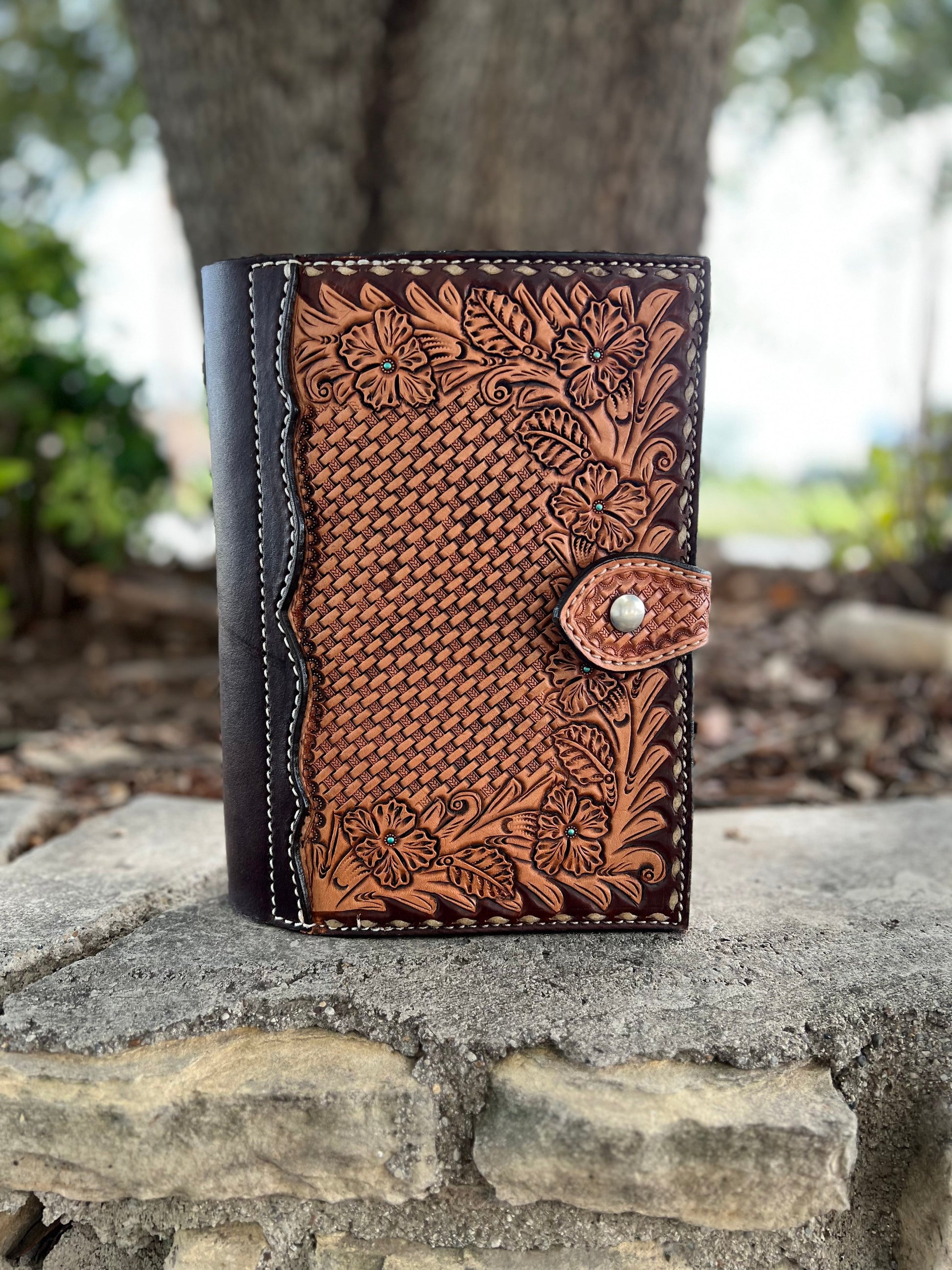 Bible Cover, in golden leather with full floral border, hand tooled with basket in the center, with paint to the edge and buckstitch.