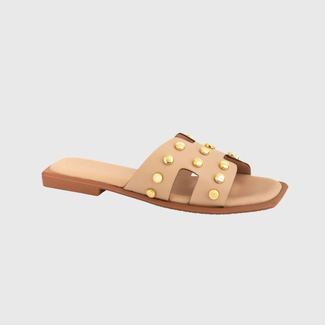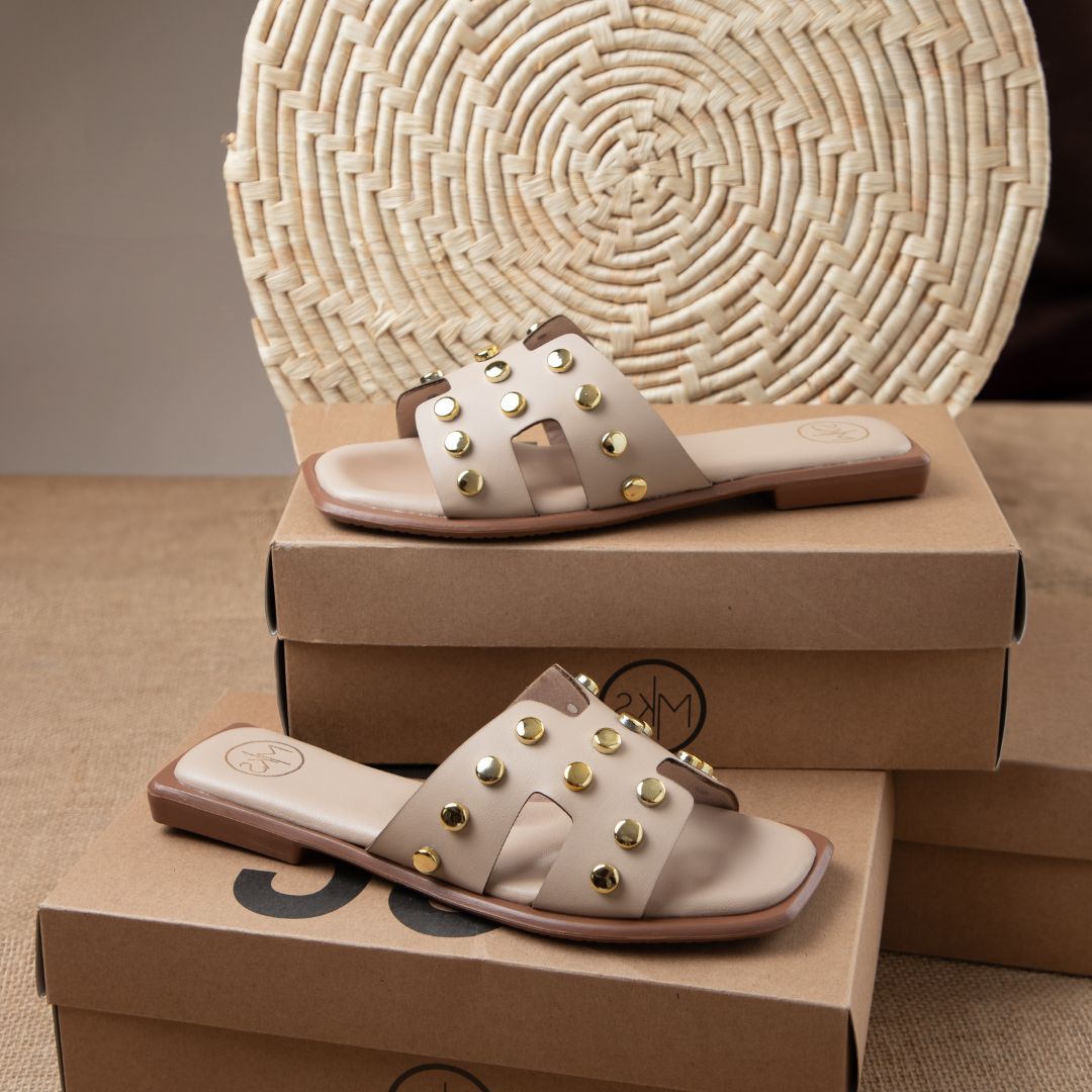 Step into style with our exquisite Faux Leather Sandals, designed to elevate your wardrobe effortlessly. The elegant gold studded straps add a touch of sophistication, making these sandals perfect for both casual outings and dressier occasions. Crafted for comfort and durability, they promise longevity while ensuring you make a bold fashion statement wherever you go. Don't miss out on the perfect blend of versatility and chic design for your footwear collection.
