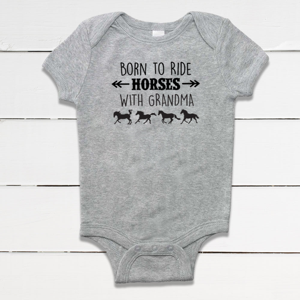 Outfit your little equestrian granddaughter or grandson early on with this adorable bodysuit! Also makes a great new baby gift. This screen printed design is available in a variety of colors suitable for boys, girls, and surprises.