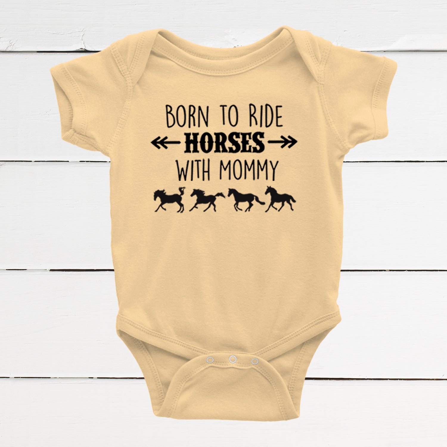Outfit your little equestrian early on with this adorable bodysuit! Also makes a great new baby gift for horsey folks. This screen printed design features white lettering and graphics on a variety of colors suitable for boys, girls, and surprises. Long sleeve option is available in limited colors and quantities.