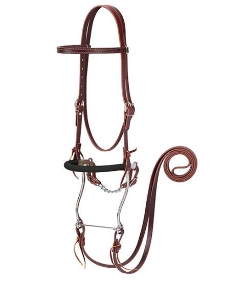 Constructed from soft, supple burgundy latigo leather, this single-ply bridle features a doubled and stitched browband, an 8-1/2" hackamore, 7' reins and a single link chain curb strap.