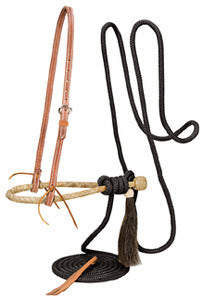 This convenient set features a rawhide bosal, a 5/8" durable russet harness leather bosal hanger with alum tanned tie laces and a black nylon mecate.
