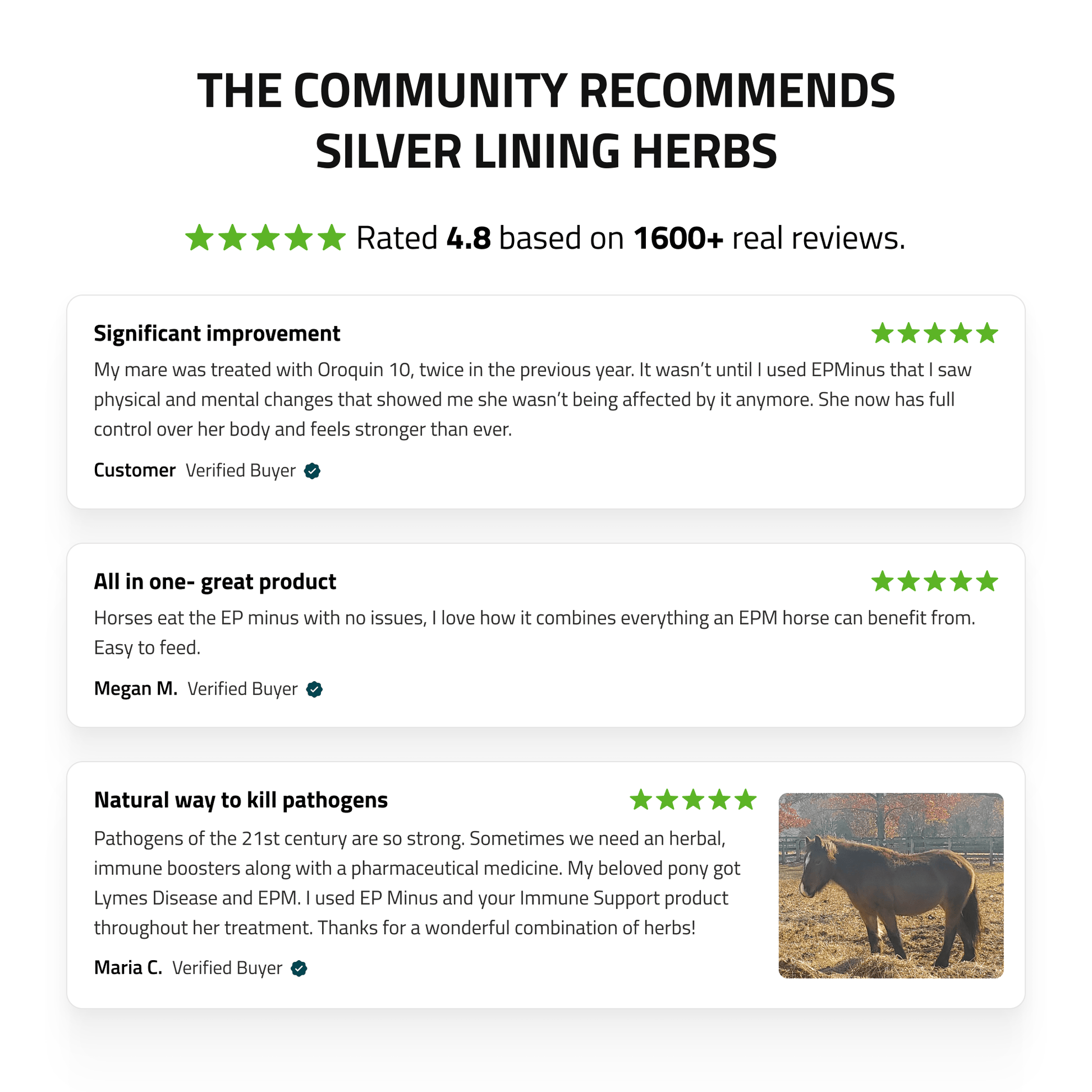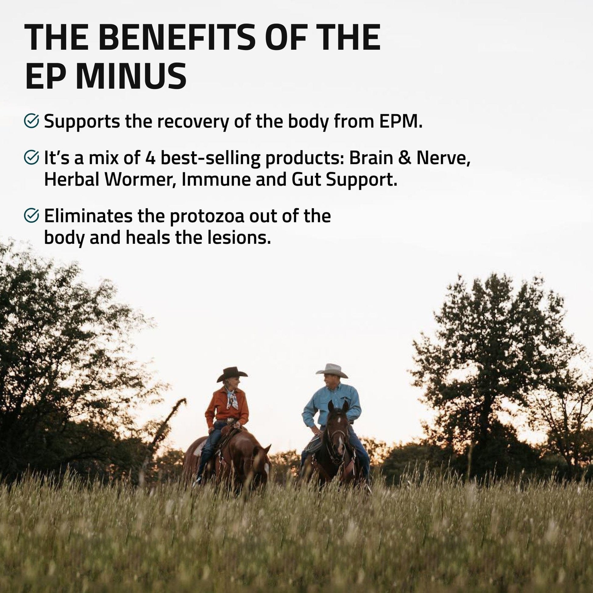 EP Minus is an essential combination of herbs that effectively supports a parasite-free system, supports normal travel patterns and gait, and provides unparalleled support to the central nervous, digestive, and immune systems of horses. It is highly recommended as a must-have for maintaining a healthy and parasite-free system. Moreover, it offers unparalleled support to the immune and digestive systems while ensuring the proper functioning of the central nervous system. Don't wait any longer to give your horse the best possible care - add EP Minus to their regimen today!