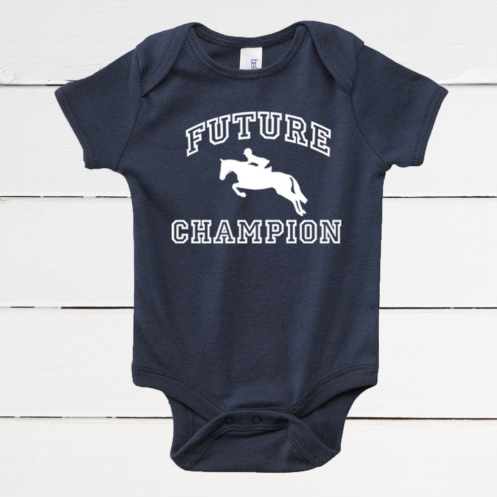 Outfit your future hunter/jumper champion with this adorable equestrian themed bodysuit, featuring collegiate style lettering and a jumping horse graphic.