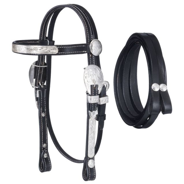 Built to match the King Series McCoy saddle, this attractive browband style headstall is crafted with quality leather and finished with single stitched waxed edge. It features intricately engraved silver accents on browband and cheeks along with silver buckles, keepers, tips, and conchos. Sold complete with set of split reins. Screw bit ends. Bit not included