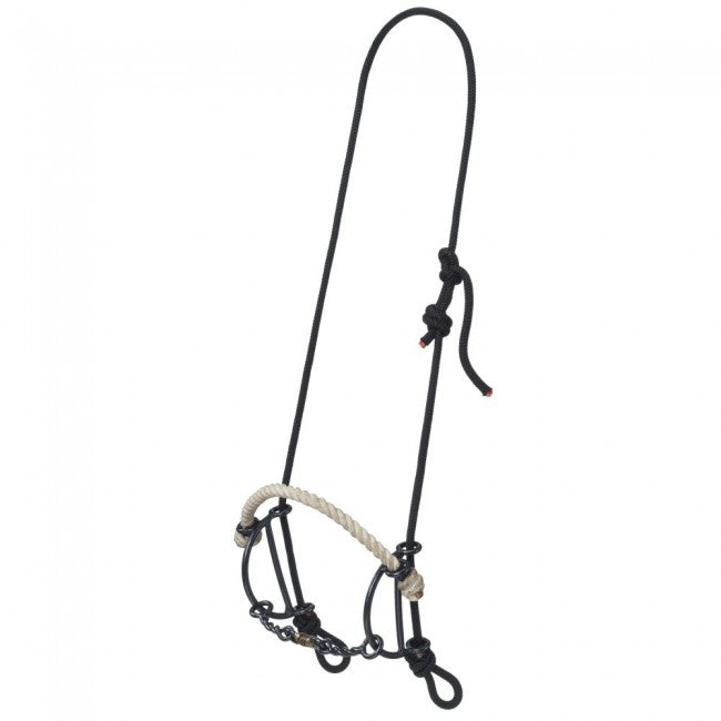 Fully adjustable using a rope halter-style knot. Designed to be used without a curb chain allowing the draw action to be unrestricted. 5” twisted dog bone gag mouth.