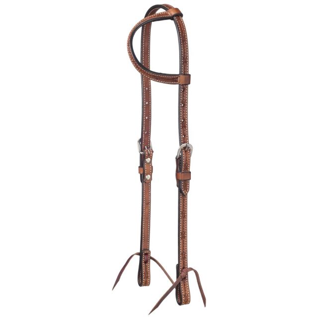 Stylish and fun, this premium cowhide headstall has a barbed wire stamp pattern. Single ear design with adjustable buckle cheeks. Tie bit ends.