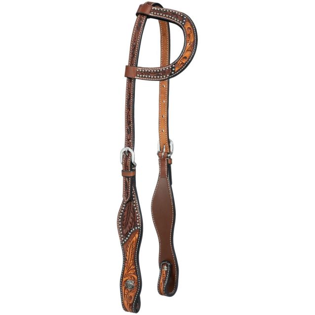The Cow Puncher single ear headstall is crafted with quality two-tone leather and designed with shaped cheekpieces. Accents include floral hand tooling and silver dots for a bit of shine. Stainless steel hardware for fit adjustments and screw bit ends with conchos.