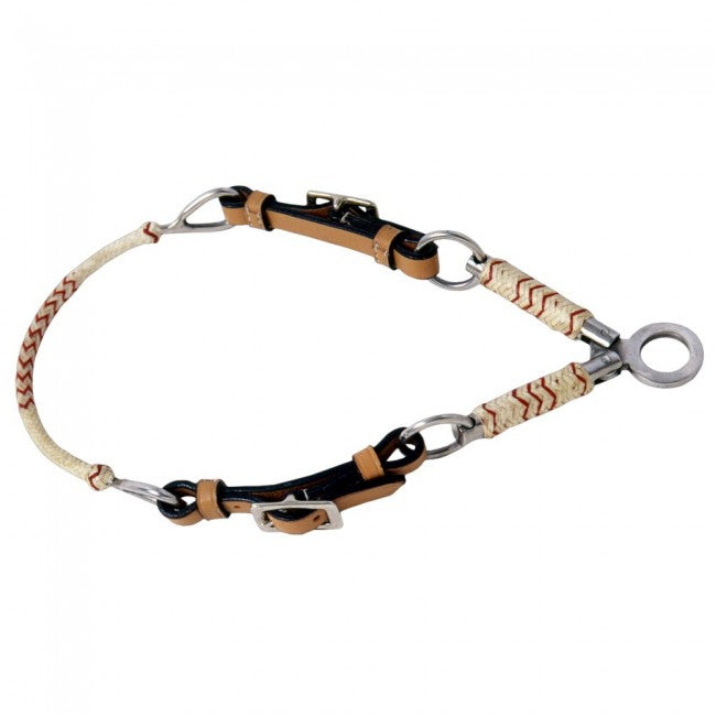 Hackamore style bosal with scissor action. Braided rawhide covered nose. Heavy latigo adjustable cheeks. Chrome plated.