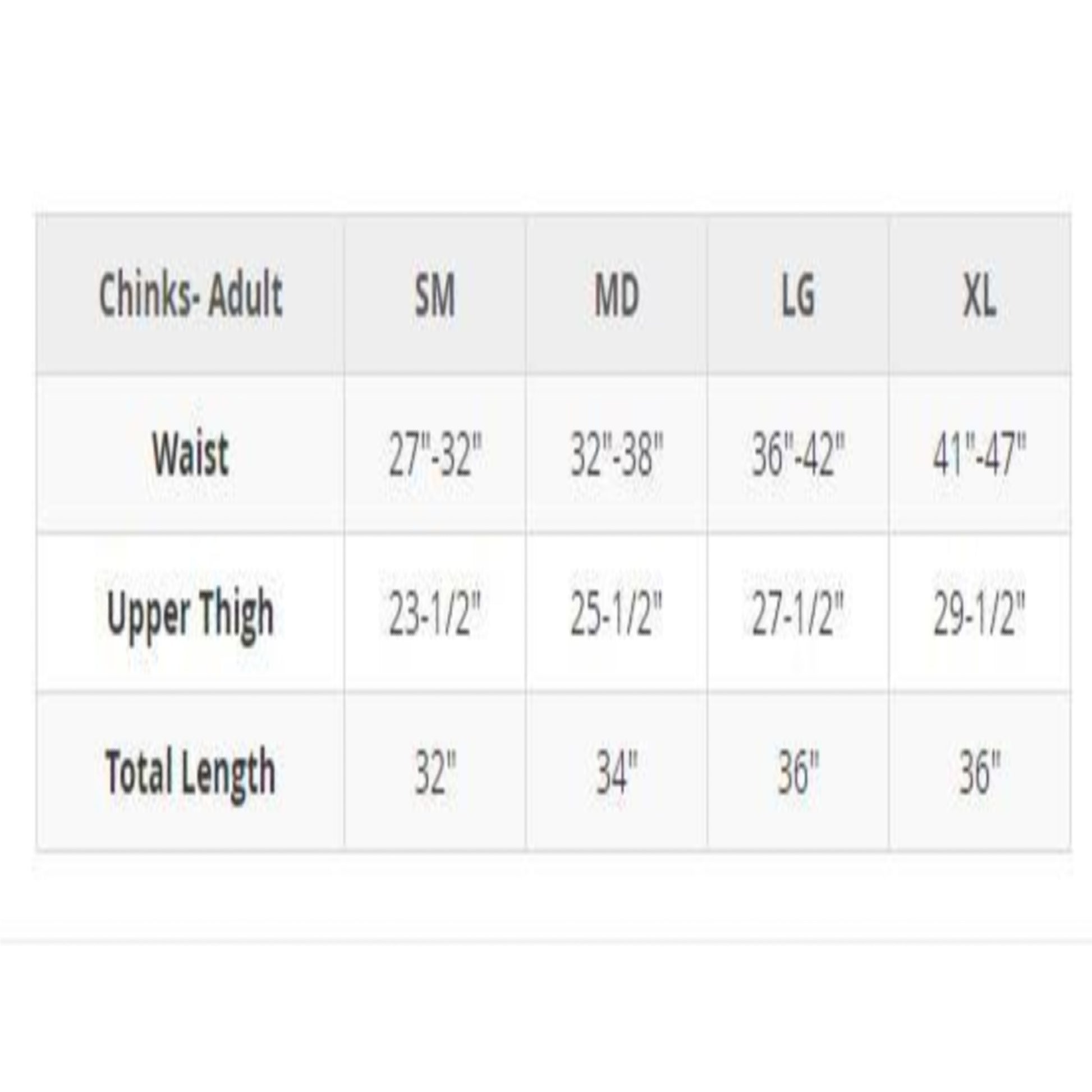 - Full length zippers, back buckle closures and front tie closures keep these chaps in place for durable, dependable performance