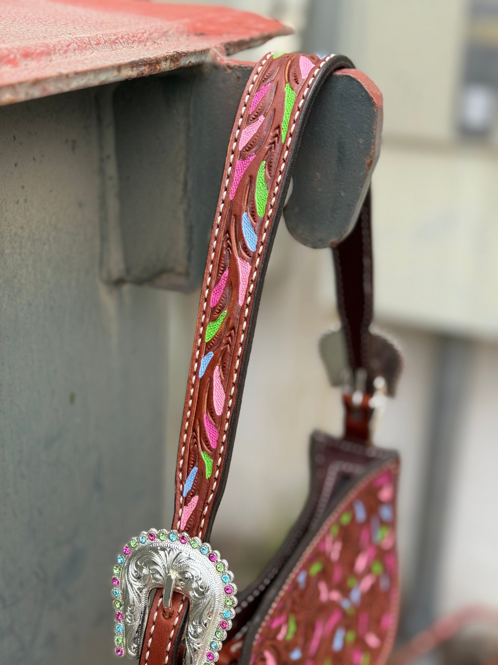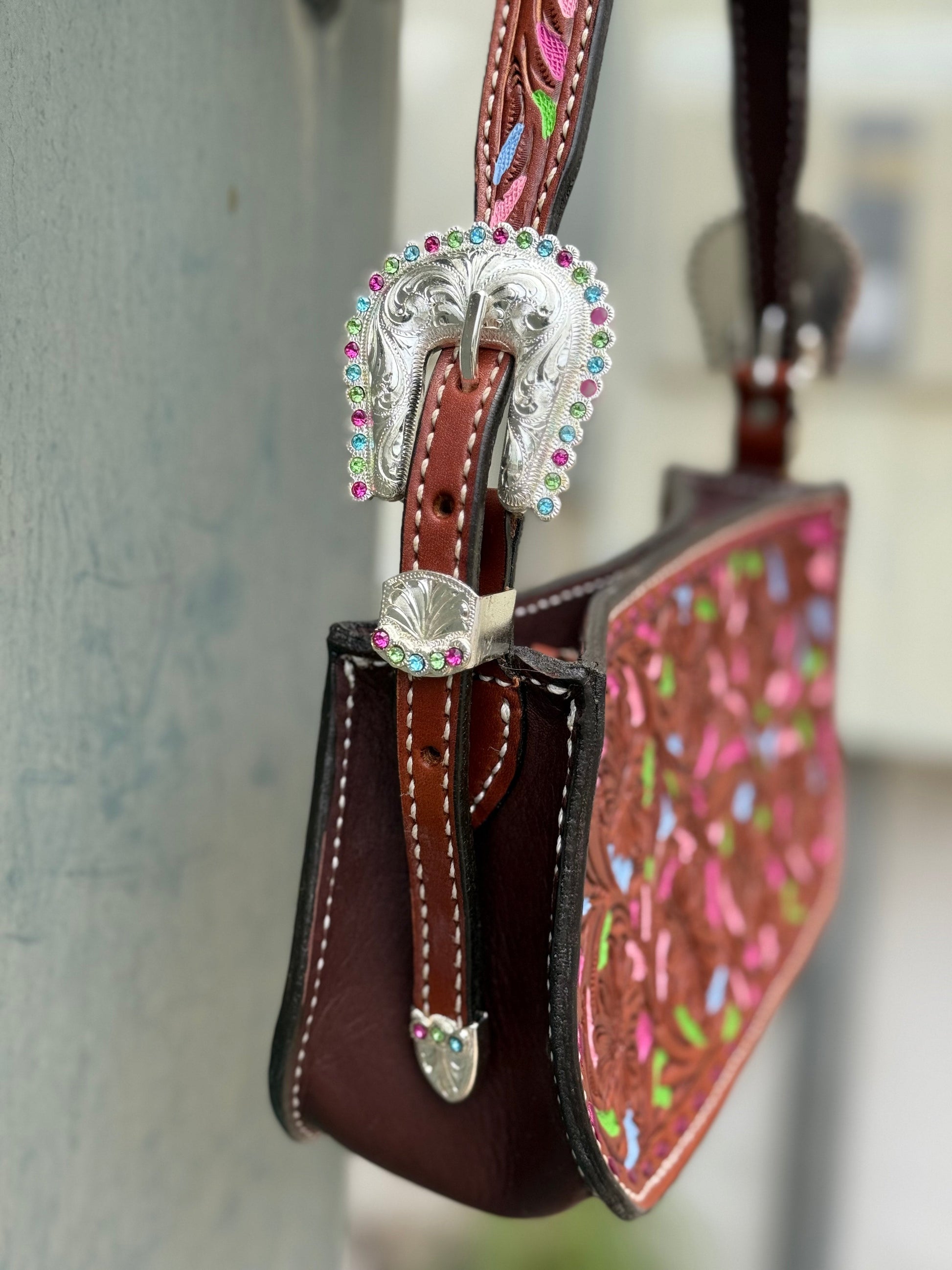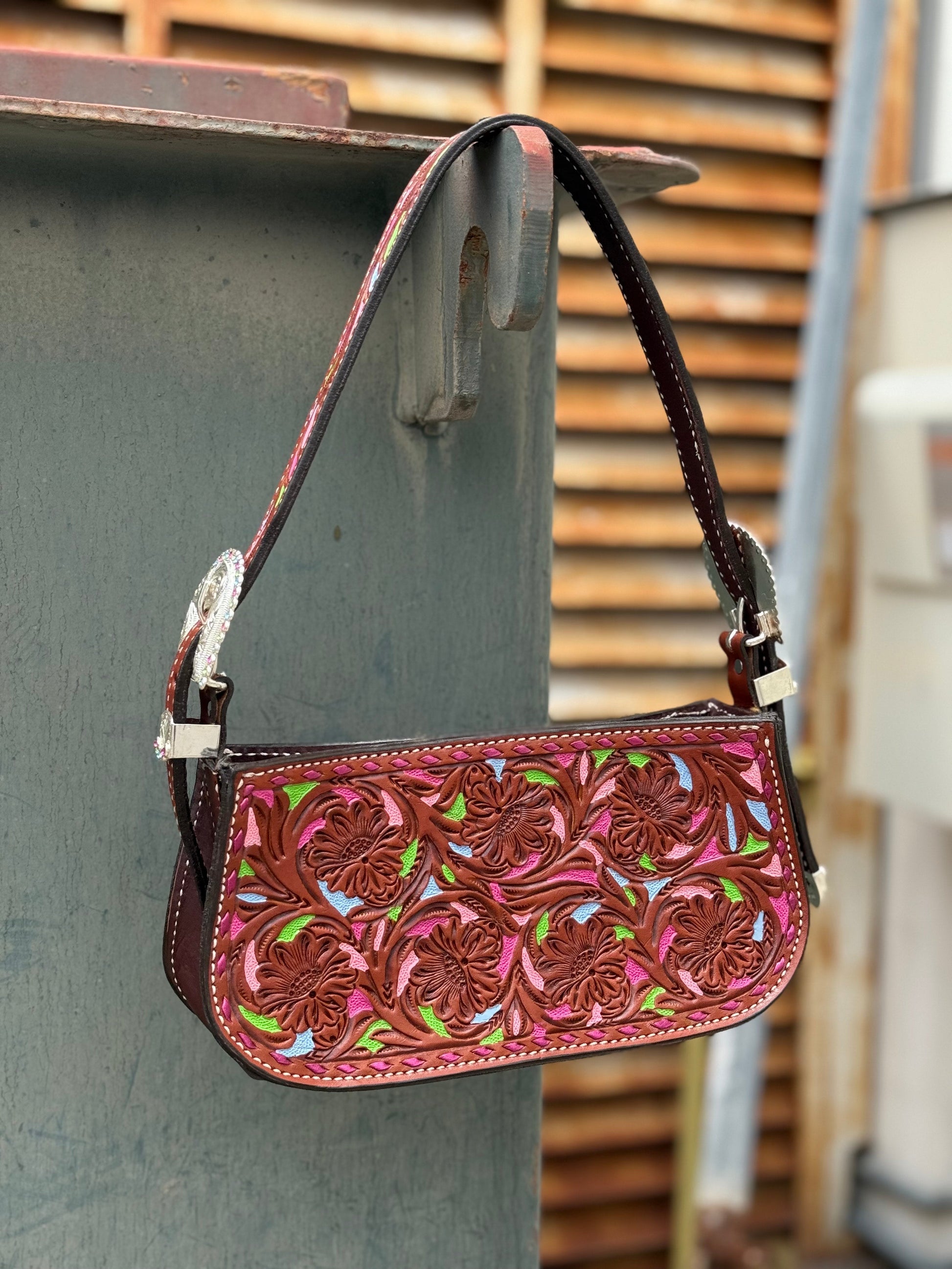 The Buckle bags, are straight out of the western 90s era! Gorgeous medium sized clutch handbag, that is 100% handmade and hand tooled, we have created 5 styles! Each with custom in-house designed buckle sets on each side! Strap is adjustable. Shortest length on shoulder 22in" to the longest of 26in". Each bag is also line and comes with a pocket slot and a zipper closure.