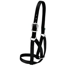 Featuring a criss-cross design, this 1" nylon halter is great for tying in the barn. Durable nickel plated hardware is in keeping with today's trends. Large size.